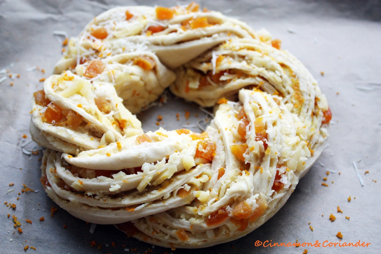 Hefekranz mit Aprikosen Orangen und Parmesan