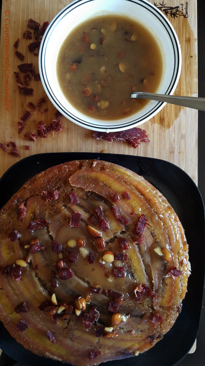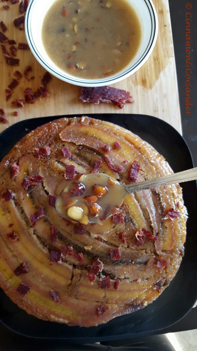 Banana Upside Down Cake with Maple Toffee Sauce & Beer Candied Bacon