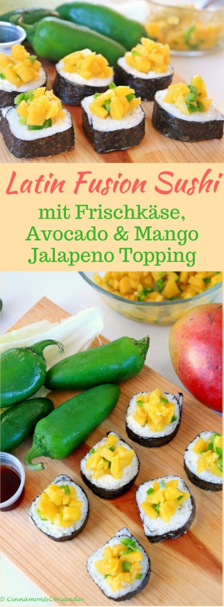 Latin Fusion Sushi mit Frischkäse, Avocado und Mango Jalapeno Topping
