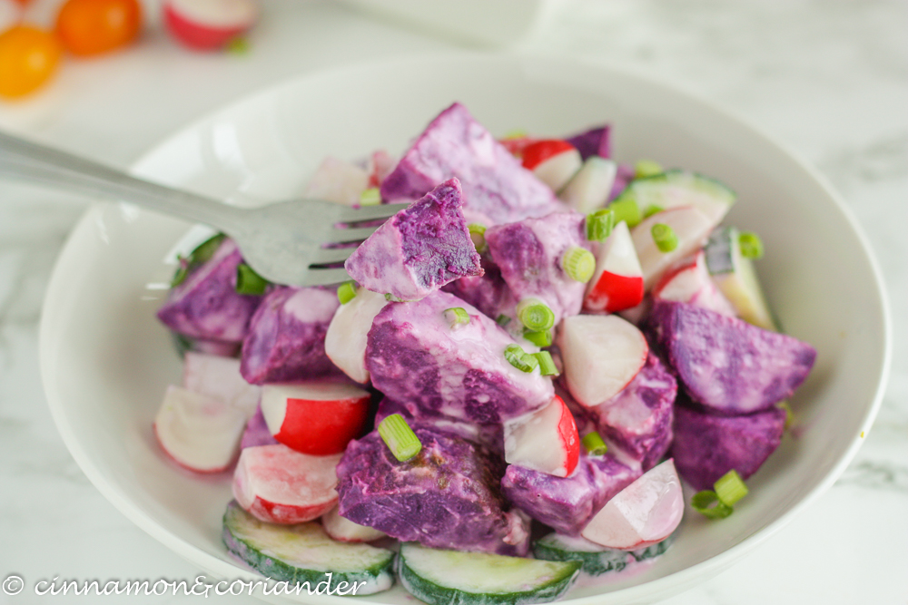 Ein gesunder, farbenfroher Salat aus gebackener Ube Süßkartoffel, Gurke, Radieschen und cremigem Kokos Dressing! Ein veganes, unkompliziertes und köstliches Rezept!