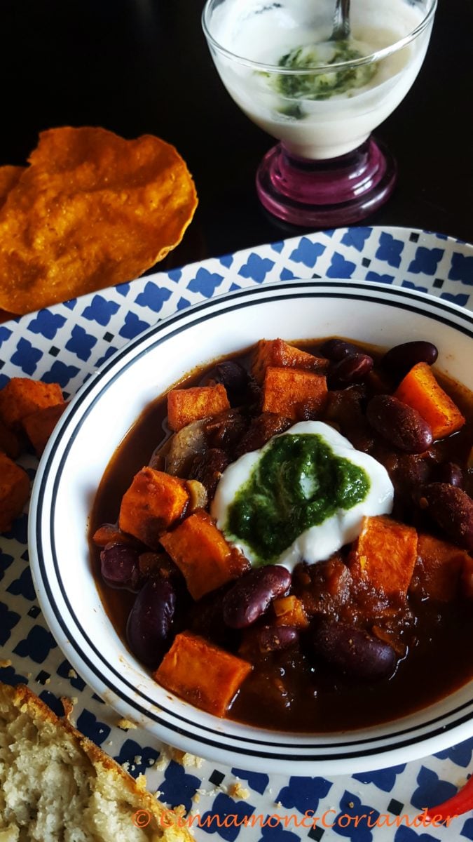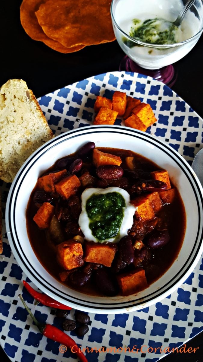 Vegetarisches Bohnen Chili mit gerösteten Süßkartoffeln
