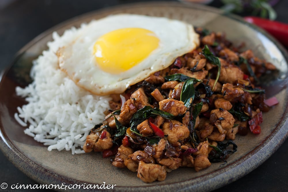 Pad Krapow Gai sofort mit Reis und Spiegelei servieren und genießen.