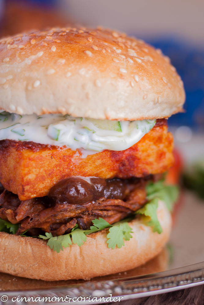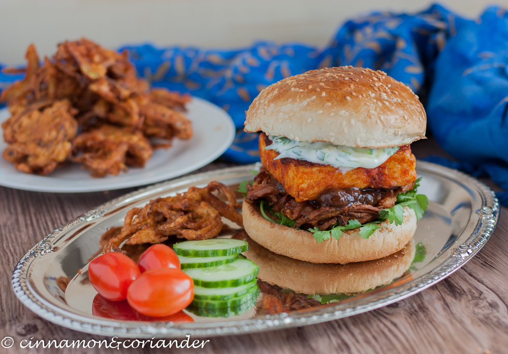 Bollywood Burger mit Knoblauch Chili Paneer, Zwiebel Bhajis und Gurken Raita