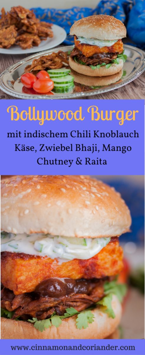 Mögt ihr mein vegetarisches Rezept für Bollywood Burger mit Chili Knoblauch Paneer und knsuprigen Zwiebel Bhajis ? Hier der Pin zum Mitnehmen!