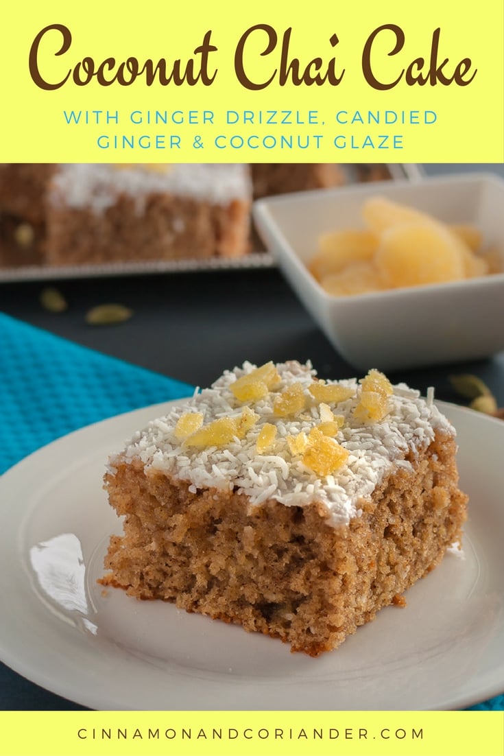 Coconut Chai Cake with Ginger Drizzle, Candied Ginger and Coconut Glaze #gingerdrizzlecake, #coconutsheetcake