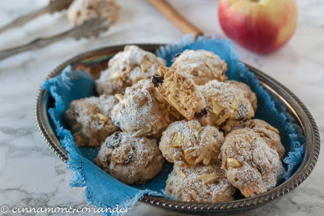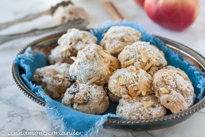 Shape little dough half balls, using 1 tbsp of batter at a time. Place balls on the cookie sheet and bake your apple cookies for 10 minutes. That’s it! Delicious German Apple Cake Cookies whipped up within minutes!