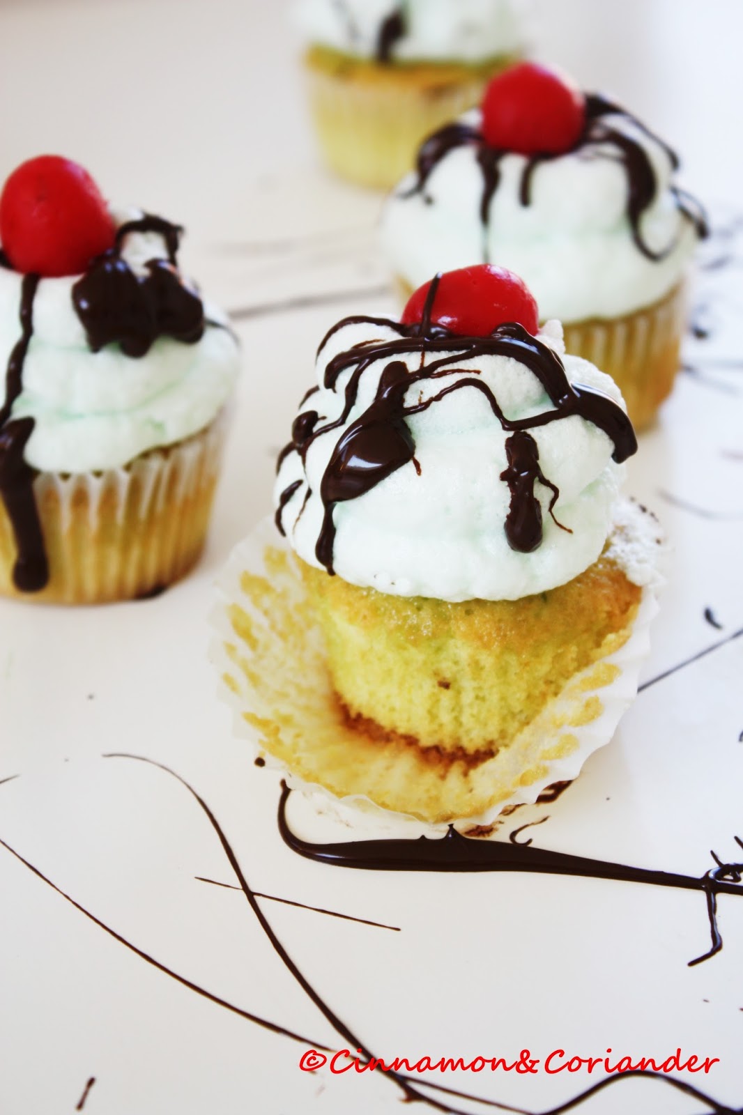 Das Frosting auf die Cupcakes spritzen und die fertigen Exemplare mit abgekühlter geschmolzener Schokolade besprenkeln.