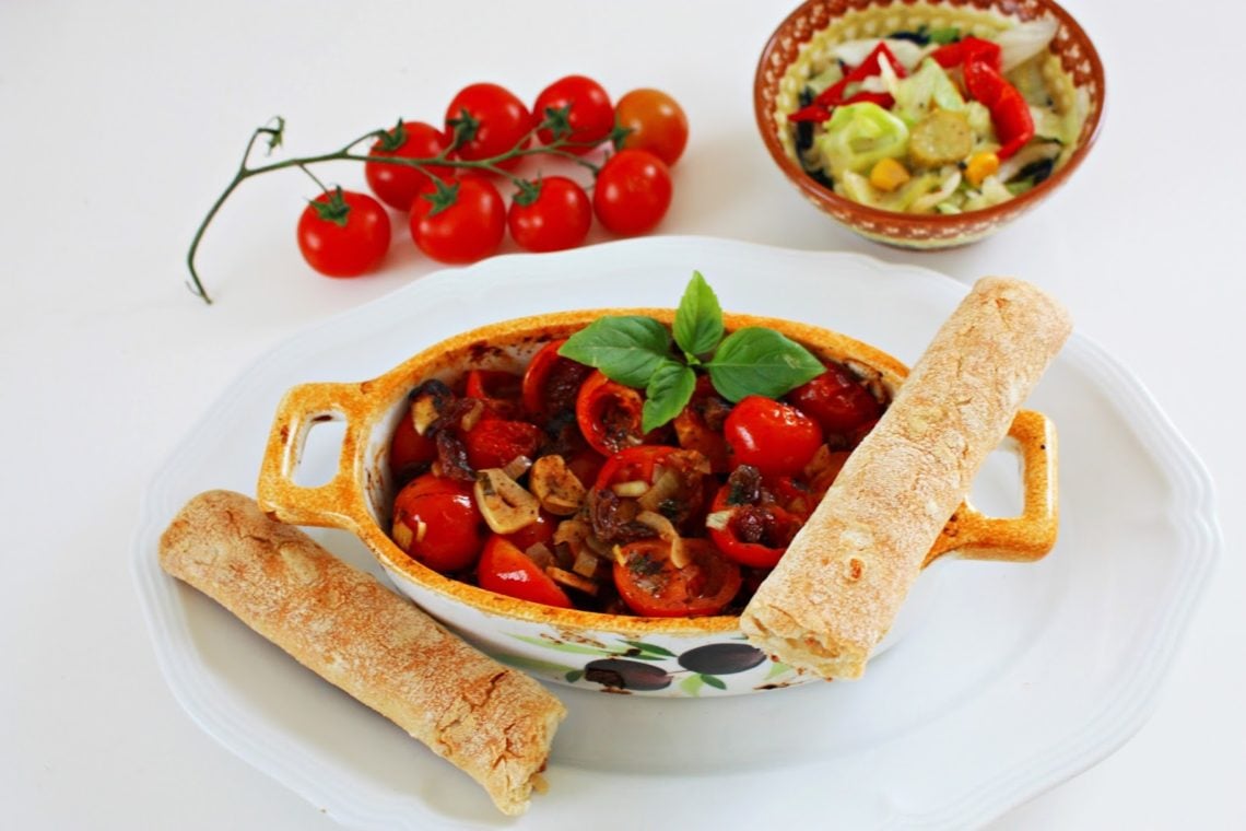 Und ab zurück in den Ofen für weitere 20 Minuten,bis die Tomaten weich und leicht karamellisiert sind.