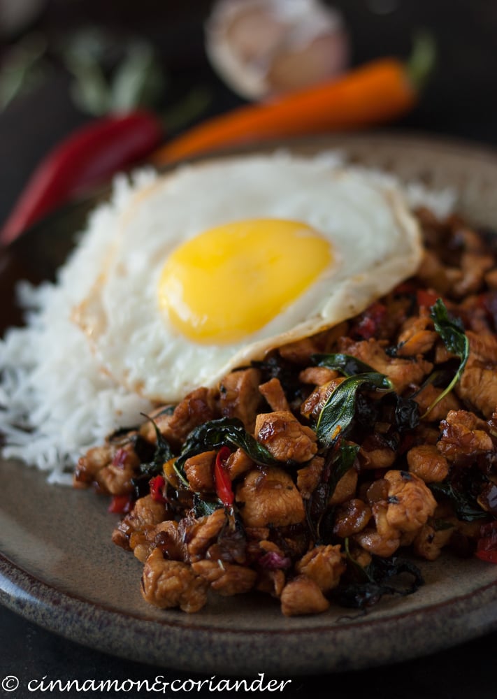 Serve Thai Basil Chicken Stir-Fry {Pad Kra Pao Gai} the authentic way – with steamed rice and a fried egg !